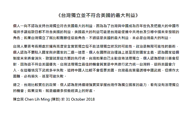 台灣人要思考長期處於擁有高度安全實質獨立但不能法理獨立狀況的可能性。政治是無限可能性的藝術,個人認為不要陷入國家與非國家的二選一迷思。個人在國際政治理論上甚至反對國家主義,認為國家這個制度未來將會消失,歐盟就是這方面的先行者。台灣如果自己主動宣佈法理獨立,個人認為即使川普會反對,因為這不符合美國優先。台灣法理獨立最佳的機會其實是中共進行武力統一台灣時,這時美國會介入,在這種情況下武統多半失敗,這時中國人比較不會怪罪美國。台灣最高策是誘導中國武統,但操作太困難,必有損失,甚至可能失敗。
